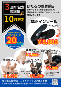・物販:矯正インソール 、ファスティング(玄米酵素) 、フロッグハンド 、フットケアクリーム各種 ・自費メニュー :角質ケア(ポイント、かかと、トータルフットケア)、英国式リフレクソロジー(30分、45分) パーソナルトレーニング(会員)、ボディメンテナンス(30分、60分)期間中何回でも20%OFFになります!